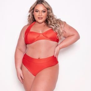 Biquíni plus size com tecido canelado bem distribuído entregando conforto e suavidades, o modelo possuí elastano ajudando no molde e alinhamento do corpo causando um efeito bem aprimorado, seu sutiã possuí alças que passam pelo pescoço dando um efeito quadriculado em seu decote, modelo meia taça com bojo e conector ao meio, calcinha cintura alta auxiliando na modelagem da barriga com complemento sofisticado. Sua cor em coral bem viva e reluzente criando um destaque único e refinado.