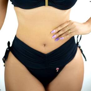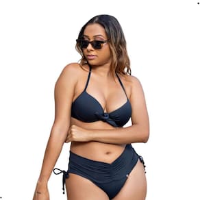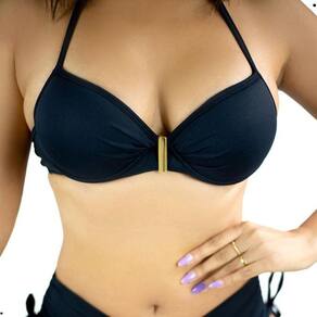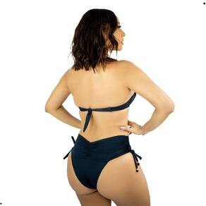 Top com bojo dando sustentabilidade ao busto, alças de amarrar no pescoço e nas costas, ideal para quem gosta de um top mais fechado e que tampa as regiões dos braços nas laterais, possui peça de metal retangular ao meio do top com opção de remoção, calcinha cobre bem o bumbum, mais alta na cintura, as laterais possui amarrações com tiras em rolete e ponteiras em metais como detalhes de ótima qualidade que não preteja. Tecido macio e confeccionado com fio de helanca para maior resistência e durabilidade da peça e forro que não penetra areia.