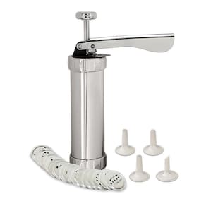 DescriçãoBiscoitinhos são bem-vindos em qualquer hora do dia, vai bem na hora do café, depois das refeições e para diminuir aquela fome repentina. A Máquina de Biscoito Manual Brinox Verona é puro charme, com seu design clássico e ótimo acabamento em inox, você pode preparar até 20 formatos diferentes de biscoitos e decorar com até 4 diferentes desenhos. Faça deliciosos biscoitos com gostinho caseiro e com os seus ingredientes preferidos e livres de conservantes. Contém:20 opções de moldes4 Bicos de decoraçãoMáquina de Biscoitos:Tamanho: 21 x 15,5 x 5,5cmComposição: Biscoiteira: Aço InoxMoldes: Alumínio