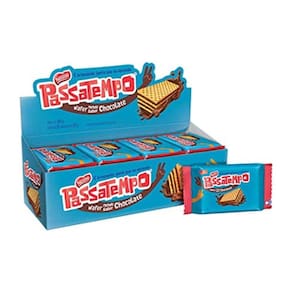 Kit contendo 28 pacotes de Biscoito mini wafer Passatempo em formato lanchinho sabor chocolate de 20 gramas cada. Totalizando 560 gramas.