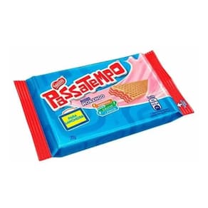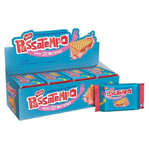 Kit contendo 28 pacotes de Biscoito mini wafer Passatempo em formato lanchinho sabor morango de 20 gramas cada. Totalizando 560 gramas.