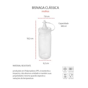 Bisnaga com tampa. O tubo com bico fino é perfeito para usar com liquidos e substancias pastosas. Um utensilio de cozinha indispensavel para lanchonetes e bares, ideal para espalhar molhos nos lanches. Bisnaga transparente produzida em Polipropileno (PP) é resistente, nao absorve umidade, atoxico e livre de Bisfenol A.