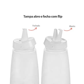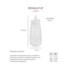 Bisnaga com tampa flip. O tubo com bico fino é perfeito para usar com liquidos e substancias pastosas. Um utensilio de cozinha indispensavel para lanchonetes e bares, ideal para espalhar molhos nos lanches. Bisnaga transparente produzida em Polipropileno (PP) é resistente, nao absorve umidade, atoxico e livre de Bisfenol A.