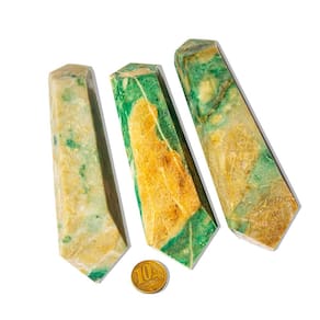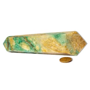 Características da PeçaNome da Pedra: JadeCor: Tons de verde vibrante, com nuances claras e escurasLapidação: Vogel Bi-Terminado com 6 FacetasMedidas Aproximadas: 14 a 15cmPeso Aproximado: Média 250gOrigem: Brasil