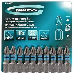 Bits de Torção Phillips 1/4 POL 25 mm PH2 com 10 Peças GROSS