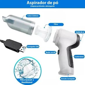Bivolt e eficiente: mini soprador aspirador de pó 3 em 1 portátil Este produto é a escolha é otimo para quem busca praticidade e eficiência na hora de realizar a limpeza de sofás, interiores de carros e estofados. Com funções e acessorios apropriados voce pode utiliza-lo como soprador para encher boias, colchoes inflaveis e etc, produto leve e compacto e potente, ideal para aqueles pessoas que mora em predios e sempre que precisa aspirar o interior do veiculo precisa buscar um serviço alternativo. Acompanha acessórios multifuncionais, cabeças de escova, que podem limpar todos os cantos do assento do carro, vãos, tapetes, porta-malas. Este aspirador de pó portátil é super potente com um motor de 120w fornece forte sucção de até 5,5 kpa, que pode facilmente absorver cabelos, resíduos de comida, partículas e menos de 0,1 mícron de detritos escondidos no sofá, almofada. Além disso, possui um filtro lavável, garantindo a máxima eficiência na remoção de poeira, pelos de animais e outras sujeiras. Com a sua facilidade de uso e ótimo desempenho, você poderá manter a sua casa, carro ou escritório sempre limpos e organizados de maneira prática e eficiente. Seu carregamento é prático e fácil podendo ser carregado em carregadores automotivos de entrada usb, carregadores de celular, power bank e até de notebooks e pcs. Especificações: Tensão de entrada: dc 7.4v Cor: azul / branco Envio de cores - aleatório - Material: plástico Potência de saída: 120w Sucção de vácuo: 6000pa Tamanho: 16,5x14,5x4cm Capacidade da bateria: 2500mah Tempo de trabalho: cerca de 30 minutos a 1 hora e meia Tempo de carregamento: cerca de 2-3 horas Poeira capacidade: 0,5l O pacote inclui: 1- aspirador de pó recarregável 1- cabo de carregamento usb 1- adaptadores de saida de ar soprador 1- recipiente para aspiração 1- tudo extensor de aspiração 1- filtro de aspiração lavavel 1- ponta de escova para aspiração em cantos Cores conforme disponibilidade em Homologação Anatel: 097082111116