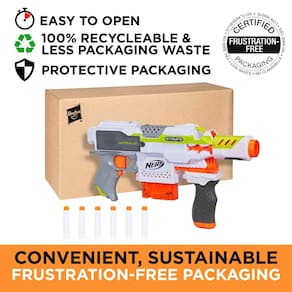 NERF Modulus Stryfe Blaster (exclusivo da Amazon) - Jateamento motorizado de 6 dardos - Personalize com alça suspensa e cano de trilho duplo - clipe de 6 dardos e 6 dardos Modulus - Jateamento com 1 mão - Dispara dardos de até 90 pés (27 metros)