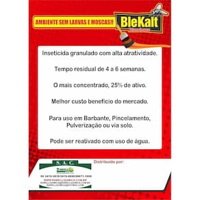 INDICAÇÕES: É indicado para controle de infestações de moscas em residências, restaurantes, comércios, matadouros e outros locais infestados de moscas. ESPECIFICAÇÕES: MODO DE USO DO FRASCO 90g BARBANTE Preparo: Em recipiente apropriado, dissolver 30g do produto em 300ml de água limpa juntamente com150g de açúcar cristal. 1° Encharcar barbantes na mistura. 2º Estender os barbantes horizontalmente a cerca de 2 metros do solo fora do alcance de crianças. PINCELAMENTO Preparo: Em recipiente apropriado, dissolver 30g do produto em 60ml de água limpa juntamente com 30g de açúcar cristal, formando uma calda, de forma que possa ser facilmente aplicado por um pincel. Pincelar a mistura em locais do pouso das moscas, pincelando os pontos de superfícies na proporção de 10 x 30cm de área, nos locais mais frequentados pelas moscas. Importante: em locais que não se pode pincelar diretamente as paredes ou superfícies, aplicar o produto em pedaços de papelão, cartolina ou plástico, fixando os mesmos em locais altos do chão, longe do alcance das crianças. PULVERIZAÇÃO EM PONTOS ESPECÍFICOS Preparo: Diluir 30g do produto em 200ml de água limpa, acrescentar 100g de açúcar cristal. Colocar a mistura em um pulverizador e pulverizar pontos específicos de pouso de moscas. PULVERIZAÇÃO DE ÁREA TOTAL Preparo: Diluir 3g do produto por litro de água limpa. Colocar a mistura em um pulverizador, borrifando todos os locais preferidos pelas moscas. Para controle de ovos e larvas, pulverizar em lixeiras, caixas de gordura e depósitos de material orgânico. Em ambos os casos, o efeito residual esperado é de 4 a 6 semanas. - Se necessário, reaplicar após uma semana. - Evite aplicar o produto em superfícies sujas, porosas ou com pinturas novas a base de cal, pois o seu efeito residual poderá ser reduzido. MODO DE USO DO SACHÊ: Dissolver o conteúdo do envelope em 60 ml de água limpa juntamente com duas colheres de açúcar cristal. Pincelar esta pasta nos locais onde as moscas preferem pousar. Repetir a aplicação sempre que a calda perder a atratividade.