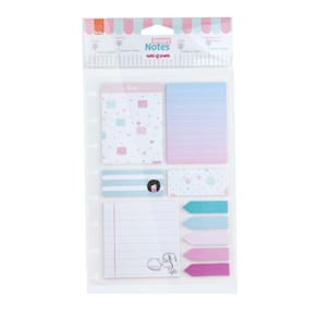 1 bloco 72x72mm com 25 folhas 2 blocos 77x58mm com 25 folhas cada 2 blocos 25x58mm com 25 folhas cada 5 marcadores de páginas de 44x12mm com 25 folhas cada