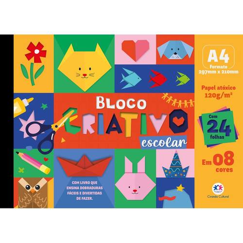 Um bloco criativo escolar para apoiar nas atividades de arte em papel. São sete itens com passo a passo de dobraduras fáceis e divertidas. Com este bloco, você vai encontrar: 24 folhas em 8 cores diferentes em tamanho A4 297mm x 210mm.
