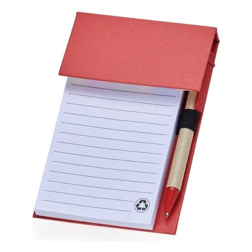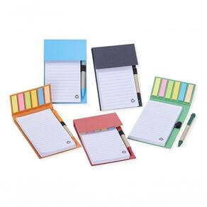 Bloco de anotações ecológico com caneta, feito em kraft com 6 blocos autoadesivos coloridos com aproximadamente 20 folhas e bloco com aproximadamente 100 folhas brancas com pauta. Possui porta caneta elástico e acompanha caneta de papelão e detalhes plásticos, carga esferográfica azul e acionamento por clique.