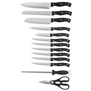 Bloco De Facas 14 Peças Aço Inox Kenya O Bloco de Facas da Kenya é perfeito para completar os utensílios da sua cozinha. Ele conta com design moderno, lâminas em aço inox e um suporte em bambu que promove praticidade e elegância para armazenar suas facas. Conjunto completo, atendendo diferentes necessidades. Cabo ergonômico, material de alta qualidade promovendo a melhor performance nos cortes e durabilidade.Especificações do Produto:- Lavar a mão- Não utilizar produtos abrasivos na lavagem- Bloco de facas robusto, poderá ser utilizado para complementar a decoração da cozinhaConteúdo da Embalagem:- 1 Faca do Chef com 20cm- 1 Faca de pão com 20cm- 1 Faca Santoku com 17cm- 1 Faca utilitária com 12cm- 1 Faca para descascar com 8cm- 6 Facas serrilhadas com 10cm- 1 Chaira (afiador) com 20cm- 1 Tesoura- 1 BlocoFicha Técnica:- Código: 4081660111- Marca: Kenya- Material: Bloco em bambu e 13 peças em aço inox e cabo de plástico- Peso: 2,36kg- Dimensões: 36,5cm x 12,5cm x 22,5cm (AxLxP)- Garantia: 3 Meses - Contra defeito de fabricação Texto Complemento - Altura - 36,5cm Largura - 12,5cm Profundidade - 22,5cm Peso - 2,36kg Sobre a Marca - A marca brasileira Kenya oferece produtos com ótima relação custo-benefício para os principais ambientes da casa, com seu portfólio dividido em Mesa, Vinho e Bar. Simplicidade e elegância são características fundamentais da marca, que traz em cada coleção de produtos para cozinha, banheiro, lavanderia, organização, entre outros, as novidades alinhadas com as últimas tendências do mercado internacional.