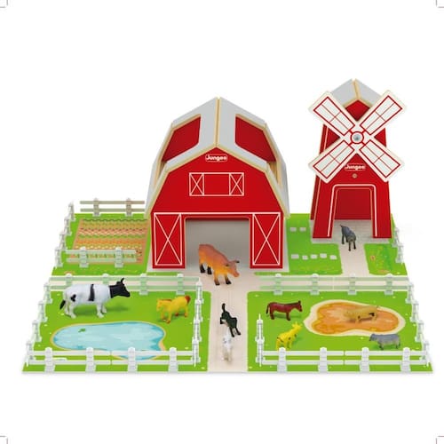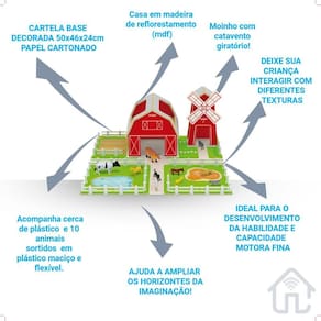 descrição do produto: a fazendinha casa e moinho é um brinquedo de construção da linha de play sets da junges. Elaborado a partir de peças em madeira de reflorestamento mdf com pintura atóxica e acabamentos em serigrafia, é composto por cartela base em papel cartonado 50x46cm, kit com 10 animais em plástico maciço e flexível, e cercas em plástico para decoração. Moinho com catavento giratório além de ser uma alternativa ecológica, é um brinquedo excelente para a criança ampliar os horizontes da imaginação, desenvolver habilidades e a capacidade motora fina. A criança tem a possibilidade de interagir com diferentes texturas, o que contribui para seu desenvolvimento e torna a brincadeira ainda mais interessante confira a linha completa da fazendinha com celeiro, casa e moinho, estábulo, que juntas formam uma super fazenda, para brincar e aprender de forma lúdica a rotina da fazenda