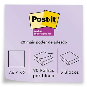 Suas folhas são reposicionáveis, ou seja, possuem Super Adesivo Post-it, que permite que sejam retirados e recolocados, sem danificar papéis ou outras superfícies, sem deixar resíduos do adesivo e sem perder a eficiência na fixação.