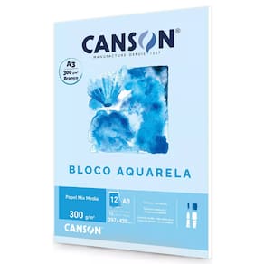 DescriçãoBloco Aquarela Canson®O Aquarela Mix Media é um papel artístico, de alta gramatura e com dupla face de utilização: texturizada e lisa. É um dos papéis artísticos com a melhor relação custo-benefício do mercado. Além de oferecer ótimos resultados, tem alto nível de conservação. Especialmente indicado para aquarela, tinta acrílica e paratécnicas secas, como giz pastel, giz oleoso e lápis de cor. Composição: 100% Celulose de Madeira.• Atóxico: Tratado contra fungos e bactérias.• Cor: Branco natural sem alvejante ótico.• pH: Neutro, ou seja, igual a 7, para evitar o amarelamento.• Textura: Delicadamente canelada, para realçar os efeitos deluz da aquarela. Também pode ser utilizada para desenho com gizpastel e tinta acrílica.• Formatos: A3 297mmx420mm.• Gramatura: 300g/m².• Sugestão de Uso: Lápis de cor, giz de cera, tinta plástica, recorte& colagem, guache e aquarela.Cores e texturasTextura dupla faceTécnicas recomendadasAquarela, Acrílico e Pastel, podendo ser utilizados também para técnicas de desenho com outros materiais como carvão, grafite, lápis de cor e sanguínea.Formatos(12 folhas):Bloco colado 1 lado: A3