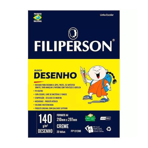 Bloco Desenho A4 Filiperson 180G 20 Folhas Com 5 Blocos Blocos de papel alcalino especial, livres de ácido, nos formatos A4 e A3, nas cores branca e creme, com gramatura 180g. Indicado para desenho a lápis, pastel, giz artístico, grafite, tinta nanquim, pinturas com tinta a óleo e acrílica. Ean: 7891634000695