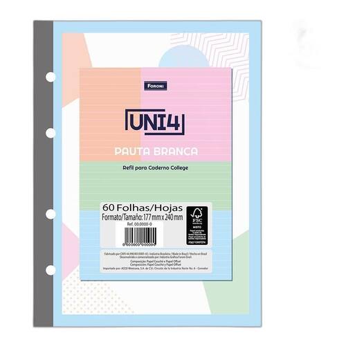Bloco Fichário Coleg UNI4 Pauta Branca Colors 60fls Foroni Refil para caderno argolado colegial pautado Medidas: 177x240mm Contém 60 folhas, sendo 15 de cada cor Gramatura do papel 63g/m As linhas das folhas são na cor branca Bloco com furação para fichário 4 fechos
