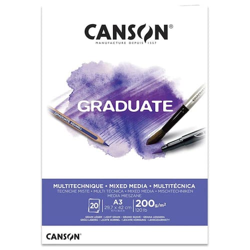 Os blocos Canson® Graduate Mixed Media possuem um papel branco, resistente e com textura fina. São compostos por 20 folhas de 200 g/m². São ideais para misturar técnicas e obter ótimos resultados. Técnicas recomendadas: técnicas mistas (lápis, aquarela, tinta acrílica, marcadores, etc..)