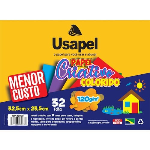 Papel criativo com 8 cores para corte, colagem e montagem, livre de ácido, pH neutro e bordas macias.