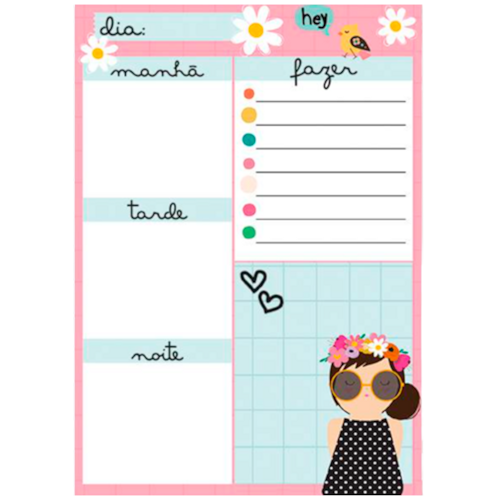 Com 60 folhas decoradas, o bloco tem espaço para todos os seus compromissos do dia além de espaços extras com listas de tarefas e anotações gerais.