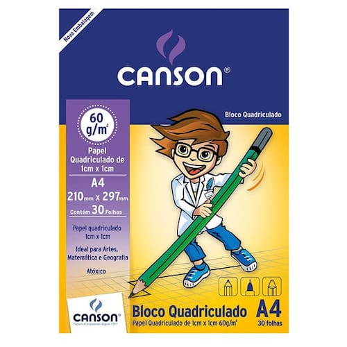 O Bloco Quadriculado Escolar Canson possui quadrados de 1cm x 1cm, indicado para crianças nas atividades de Educação Artística e Matemática.