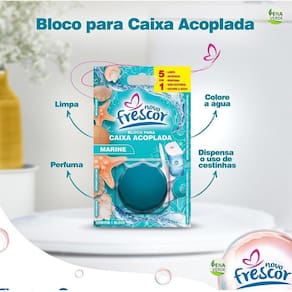 INSTRUÇÕES DE USO: 1 - Retire o bloco da embalagem plástica. 2 - Abra a tampa da caixa acoplada, em seguida insira o bloco Novo Frescor posicionando o produto longe da saída de água. 3 - Recoloque a tampa da caixa acoplada e aguarde 10 minutos para acionar a descarga. 4 - Quando a coloração da água diminuir, coloque outro Bloco para Caixa Acoplada Novo Frescor. Precauções e Segurança: Conserve fora do alcance das crianças e dos animais domésticos. Não expor o produto ao sol e calor acima de 35ºc. Não reutilizar a embalagem vazia. Lavar as mãos após o manuseio do produto. Em caso de contato com os olhos, lavar com água em abundância. Em caso de ingestão, não provocar vômito e consultar imediatamente o centro de intoxicações ou serviço de saúde mais próximo levando a embalagem vazia. Nunca reutilizar a embalagem vazia.