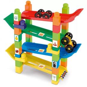 A Blocolândia Rampa maluca, da Dismat, é fabricada em plástico de alta qualidade para garantir durabilidade e resistência durante seu uso. Ela conta com 34 peças grandes e coloridas para segurança de seu bebê, evitando o risco de serem engolidas. Sua variedade oferece à criança liberdade para usar a criatividade e imaginação ao criar um cenário, montando pistas duplas ou uma única pista de 4 andares. Ele irá estimular a inteligência, criatividade, planejamento, organização, concentração, raciocínio lógico, aprendizado das formas e melhorando as habilidades motoras, foco e a concentração. Dentre as peças, acompanha 22 pinos simples, 6 pinos duplos, 4 rampas, 2 carrinhos e uma cartela de adesivos, sua embalagem permite armazenar as peças, otimizando em sua organização.