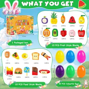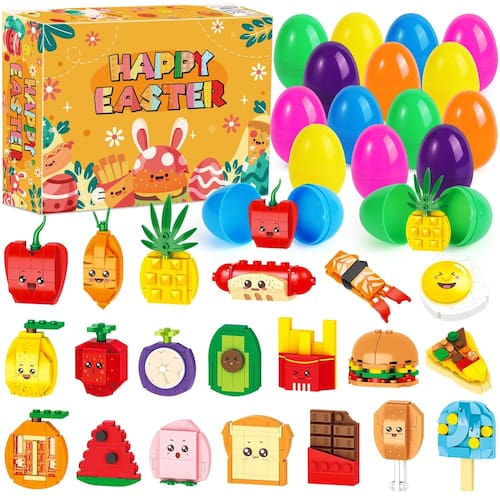 Blocos de montar com enchimento de ovos de páscoa – 20 peças de fast food e blocos de frutas com ovos de Páscoa de plástico para cesta de presente de Páscoa, festa de caça de Páscoa - Conjunto de blocos de Páscoa: inclui 20 blocos (frutas e fast food) e 20 ovos coloridos, cada bloco tem estilo diferente, como hambúrguer, chocolate, batatas fritas, pizza, melancia, maçã, pera, etc. Cada mini bloco vem com instruções coloridas, passo a passo claro e fácil montagem - Material: tudo feito de material ABS de alta qualidade, boa textura, resistente e durável, os blocos são montados, coloridos e compostos de blocos vívidos - Fácil de usar: vem com instruções simples e é fácil de montar, observe que eles são feitos de blocos menores, o que os torna um desafio gratificante para crianças pequenas, com a ajuda necessária dos pais - transformando a hora de brincar em uma equipe colaborativa, tempo entre pais e filhos - Brinquedos de blocos de construção: as crianças podem melhorar a atenção, a coordenação olho-mão, desenvolver paciência e atenção durante o processo de montagem, dando-lhes uma sensação de realização e aproveitando a diversão da exploração - Presente de Páscoa: estes blocos de comida e frutas são um presente divertido para crianças, trazem alegria para crianças, adequado para enchimentos de cesta de Páscoa, festa de caça de Páscoa, presentes de aniversário, prêmios de sala de aula