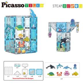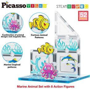PicassoTiles Magnet Tile Building Blocks Conjunto temático de animais marinhos de aquário com bonecos de ação de 8 personagens, construção STEM, azulejos magnéticos, brinquedos, crianças pré-escolares, meninos e meninas, 3 ou mais PTQ15