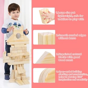 Blocos de construção grandes de madeira para crianças de 1 a 3 anos, conjunto de 64 peças grandes de blocos de madeira com caixa de armazenamento de madeira, blocos grandes para crianças, conjunto de construção de brinquedos de montar e empilhar - Blocos de madeira grandes para crianças: o conjunto de blocos de madeira tem 64 peças de blocos grandes em várias formas, meio cilindro, ponte de arco, cilindro, cubóide, colunas triangulares. O conjunto vem com uma caixa de madeira para armazenamento fácil e organizado, ideal para crianças em construção versátil em casa, creche ou escola - Brinquedo imaginativo aberto: os blocos de construção são o clássico brinquedo aberto. Pequenos arquitetos podem liberar sua criatividade para construir figuras de grande escala, edifícios, castelos, qualquer coisa que seu filho possa imaginar - Habilidades e desenvolvimento STEM: oferece às crianças horas de diversão, tempo de diversão sem tela, ajuda a estimular a imaginação e a criatividade das crianças, desenvolve uma boa coordenação olho-mão, habilidades motoras finas e habilidades de construção - Blocos de construção e empilhamento seguros para crianças: feitos de madeira de pinho da Nova Zelândia selecionada, os blocos não são pintados, suaves ao toque sem lascas, seguros para crianças pequenas. Blocos grandes e leves são fáceis de segurar, empilhar e construir. Em conformidade com o padrão de brinquedo dos EUA, aprovado pelo teste - Ótima escolha para crianças: os blocos de montar sempre foram um brinquedo indispensável no crescimento infantil, seus filhos adorariam construí-los repetidamente. Todos vão adorar este brinquedo versátil
