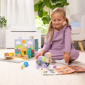 - O conjunto Town Play inclui 30 blocos de madeira, 4 bonecos de brinquedo, 32 conectores, 2 árvores de feltro e um balanço/corrediça/alça de feltro com conectores embutidos, 4 rodas e um guia ilustrado para montar um balanço, balancim, carrossel, veículo, animais de estimação e muito mais