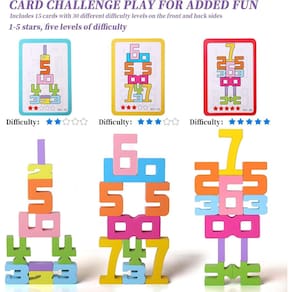 Desbloqueie a magia da matemática e da criatividade! O conjunto de blocos de empilhamento mágico de matemática transforma o aprendizado em uma aventura emocionante! Projetado para crianças a partir de 3 anos, este brinquedo STEM de 20 peças combina aritmética, engenharia e brincadeiras imaginativas em uma experiência envolvente. Por que pais e professores adoram: Aprenda através da brincadeira: a altura de cada bloco corresponde ao seu número (por exemplo, "12.7 cm = 5 cm). As crianças descobrem que 5+5 = 10, 4 + 6 = 10 e muito mais, tornando os conceitos abstratos de matemática tangíveis e divertidos! - Dificuldade adaptável: comece com empilhamento simples (1 estrela) e avance para desafios complexos (5 estrelas). O sistema de 30 níveis cresce com as habilidades do seu filho, garantindo um envolvimento infinito. - Segurança em primeiro lugar: bordas lisas e arredondadas e plástico livre de BPA priorizam a segurança das crianças. Os blocos atendem aos padrões ASTM e CPSIA, dando tranquilidade aos pais. Perfeito para: - Presentes de aniversário, presentes de feriado ou recompensas temáticas STEM. - Pais que estudam em casa procurando ferramentas matemáticas práticas - Creches e pré-escolas promovendo brincadeiras cooperativas. Detalhes do produto: - Inclui**: 20 blocos de empilhamento (alturas de 1 cm a 10 cm), 15 cartas de desafio (30 níveis), 10 placas de base numeradas (1 a 10). - Dimensões**: Maior bloco: 3,93" x 1,57" (10 cm x 4 cm). Armazenamento compacto com uma bolsa de cordão reutilizável. - Faixa etária**: 3+ anos. - APRENDIZAGEM INSPIRADA EM MONTESSORI: Nossos blocos numéricos de madeira inspirados em Montessori incentivam o aprendizado natural por meio da brincadeira, ajudando as crianças a desenvolver efetivamente o reconhecimento de números e habilidades matemáticas precoces - Várias opções de jogo: com 20 blocos resistentes e 15 cartas de aprendizagem, este conjunto oferece 30 métodos de aprendizagem diferentes para crianças de todos os níveis de habilidade e promove a criatividade enquanto as crianças exploram e constroem! - Melhore as habilidades básicas: a exposição aos nossos blocos numéricos de madeira ajuda a melhorar as habilidades motoras finas, a consciência espacial e as habilidades cognitivas, fornecendo aos jovens alunos uma ferramenta de desenvolvimento holística - Crie habilidades matemáticas na brincadeira: dê ao seu filho uma boa base com estes blocos numéricos de madeira estilo Montessori. Ótimo para aprender matemática precoce, reconhecimento de números e criatividade infinita! - Materiais seguros e ecológicos: feitos de madeira ecológica de alta qualidade, estes blocos de madeira são duráveis, seguros para crianças e garantem uma experiência de aprendizagem divertida e tátil!