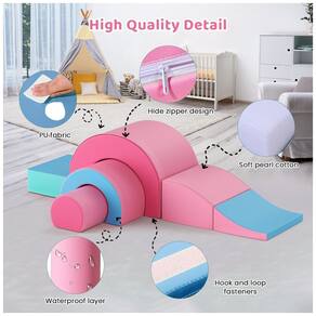 "Segurança e Conforto" – O conjunto de brinquedos de escalada é feito de algodão perolado de alta densidade para garantir durabilidade e resistência à deformação. O revestimento espesso em couro PU é à prova d'água, resistente a rachaduras, amigo da pele e antiderrapante, proporcionando mais conforto e proteção para o bebê.