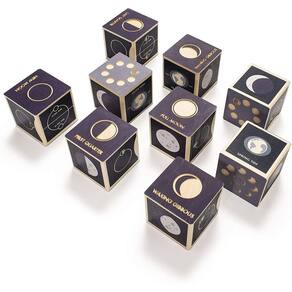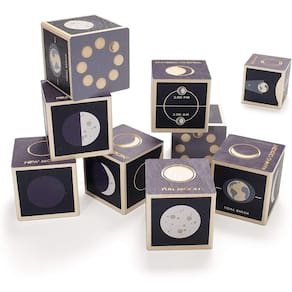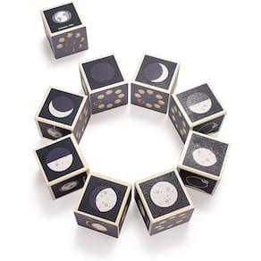 Este conjunto de 9 blocos mostra cada uma das 8 fases da lua. Dois lados debossados apresentam uma fase lunar e sua localização de ciclo. Quatro lados impressos revelam os tempos de ascensão e conjunto da lua, efeitos das marés, uma ilustração de fase e a localização da lua em relação ao sol. Este conjunto também inclui um bloco bônus dedicado ao eclipse lunar