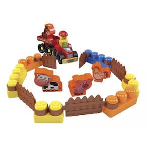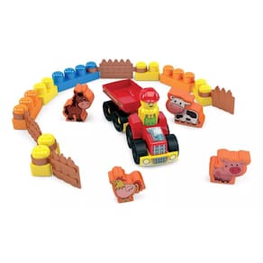 - Contém: 2 pinos triplos, 4 pinos duplos, 1 pino quadruplo, 2 chassis, 1 vaca, 1 galinha, 1 cavalo, 1 porco, 1 boneco, 1 trator, 1 carretão, 4 cercas.