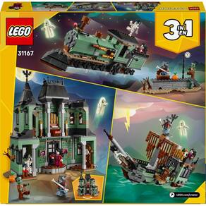 Viva histórias assustadoras com o conjunto LEGO Creator 3em1 Mansão Assombrada (31167) A casa assombrada de dois andares está cheia de detalhes e recursos de arrepiar, incluindo um portão de frente que abre, um cemitério, uma árvore assustadora destacável, um órgão, um fantasma escondido revelado ao girar uma roda e uma parte traseira que abre para ainda mais valor lúdico Meninos e meninas maiores de 9 anos desfrutam de três opções de construção com as mesmas peças: uma casa assombrada interativa, um navio assombrado ou um trem assombrado com uma plataforma Cada conjunto inclui cinco minifiguras: um lobisomem, vampira, fantasma com uma capa que brilha no escuro, o monstro de Frankenstein e um esqueleto