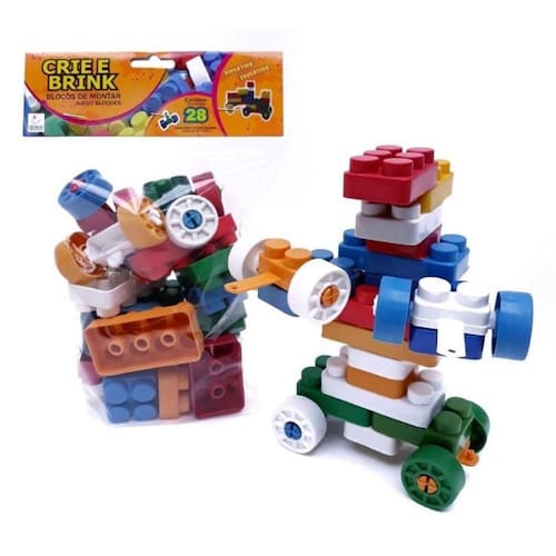 Blocos De Montar Crie E Brink 28 Peças - Usalar Blocos de montar crie e brink 28 peças em plástico contando com as rodas e os eixos separados, brinquedo educativo, divertido que desenvolve a imaginação e estimula o senso de criação, em varias cores e formatos, Blocos de montar estimulam a percepção de cores e coordenação motora. As crianças vão ficar super felizes com esses blocos de montar. A facilidade de brincar e depois guardar podendo levar para onde quiser, é bom para os pais e filhos. Ideal para dar de lembrança em festa de aniversário podendo personalizar. As peças grande: 6 cm x 3 cm x 1,7 cm As peças médias: 4,5 cm x3 cm x1,7 cm As peças pequenas: 3 cm x 3 cm x 1,7 cm Eixo com engate e com as rodas 6 cm x 5 cm x 3 cm Eixo sem engate e com as rodas 6 cm x 3 cm x 3 cm Código: 080832 Dimensões aprox. da embalagem em cm: 6x15x17 Peso liq. Aproximado do produto na embalagem: 104g Referência do produto: GB002A Certificado Inmetro: ce-bri/icepex-n 01370-94 Conteúdo da Embalagem: 28 peças de montar Composição/material: Plástico Idade recomendada: a partir de 03 anos Garantia: 90 dias contra defeitos de fabricação pelo fabricante Imagens meramente ilustrativas. As cores e tonalidades podem variar. Gênero - Meninos Idade - 3 anos 4 anos 5 anos 6 anos 7 anos Quantidade de Peças - Até 50 Peças Ean: 7898463080171
