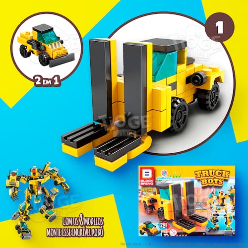 Itens da Embalagem: - 1 Caixa Blocos de Montar e Desmontar (Nº 1) Caminhão Empilhadeira 2 em 1 Robô Transformers Truck Bots Block Brinq 49 Peças.