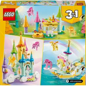 Viva aventuras em um mundo mágico de fantasia com este conjunto LEGO Creator 3em1 Castelo de Unicórnios (31175) O castelo com seis torres inclui uma casa de pássaro com um pássaro, uma escada de arco-íris, uma fonte, uma sala de diamantes, um telescópio e uma cenoura dourada Ele também inclui um unicórnio, um Pégaso rosa, um Pégaso rosa e um unicórnio branco que as crianças usam para criar histórias incríveis Meninas e meninos ganham três opções de conjuntos LEGO para construir com as mesmas peças: um castelo; um navio unicórnio com uma vela de arco-íris; ou um playground com uma cabana na floresta, jardim e mesa de piquenique