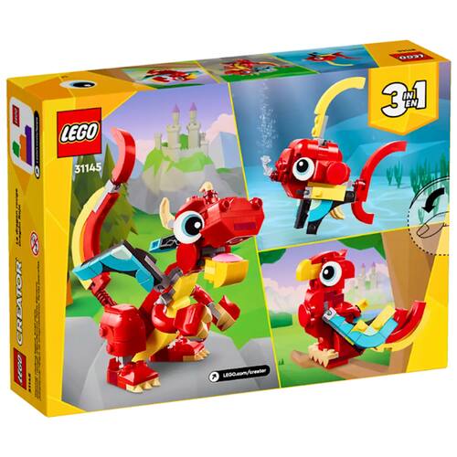 Crianças criativas com mais de 6 anos podem viajar para uma terra mágica para contar histórias divertidas com este conjunto de construção de brinquedo animal Dragão Vermelho 3 em 1 (31145). Possui um brinquedo de dragão amigável, que tem olhos grandes e braços, mãos, asas, pernas, pés, cabeça e boca ajustáveis, para que as crianças possam escolher como usá-lo para aventuras de brincadeira e exibição depois.