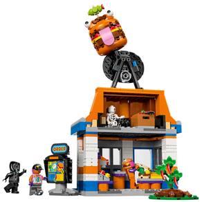 Descrição do produto : " Estimule a criatividade das crianças com o conjunto de construção LEGO® Fortnite® Durrr Burger Restaurant (77076) para meninos e meninas a partir de 10 anos. Baseado em um local icônico dos games, o brinquedo permite que os fãs criem histórias criativas. Os jogadores se divertirão montando a maquete do restaurante Durrr Burger, que é modular para incentivar a personalização, antes de descobrir todos os detalhes deliciosamente divertidos. No interior, as crianças encontrarão uma estação de condimentos, uma máquina de refrigerantes e uma caixa registradora, e do lado de fora, uma área de estar com uma xícara e um ovo frito. Há também um sótão removível que inclui uma figura de aranha e espaço suficiente para outros acessórios, como uma pá e dinamite. As minifiguras do Beach Bomber, Beef Boss, Grimey e esqueleto dão vida à ação e incentivam a imaginação. Um ótimo presente para jogos, este conjunto desbloqueia uma roupa especial Beef Boss no videogame LEGO Fortnite, que os jogadores podem resgatar escaneando um código QR na capa das instruções de construção. O conjunto contém 546 peças. : "