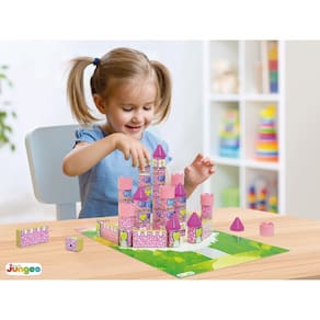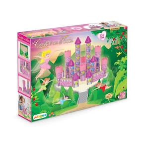 Castelo das Fadas é um brinquedo de construção da Junges. Elaborado a partir de bloquinhos em madeira de MDF com peças de plástico para as torres e telhados, é composto por cartela/base decorada 29x41cm em papel cartonado e cartela de adesivos para decoração dos bloquinhos.