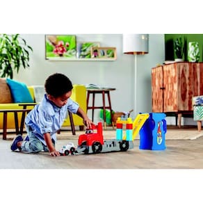 Reconfigure a grande plataforma e use o corpo do caminhão como base para os blocos de construção e as pistas de corrida incluídos. Organize a rampa de maneiras diferentes para construir todos os tipos de acrobacias de corrida.