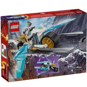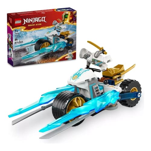 Entre em ação com Zane em sua Motocicleta de Gelo incrível! Vestido com sua armadura de torneio especial e empunhando 2 catanas douradas, ele está armado e pronto para a batalha! Entre no modo de ataque completo pressionando o pneu traseiro da motocicleta para desdobrar as lâminas de gelo frias de ambos os lados Agora, o Zane pode derrotar qualquer inimigo ninja em seu caminho!