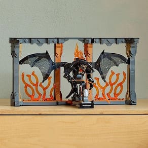 Crie uma janela para a Terra-média com o kit de decoração de estante LEGO® Icons O Senhor dos Anéis: Aparador de Livros do Balrog™ (10367) Uma ideia de presente divertido para apaixonados por livros e fãs da lendária trilogia de filmes Coloque o aparador entre seus romances favoritos para um vislumbre no mundo fantástico de JRR Tolkien ou abra-o para revelar um display impactante que retrata o duelo épico entre Gandalf e o Balrog na Ponte de Khazad-dûm Possui uma placa com as palavras “Você não vai passar” em inglês, o modelo retrata Gandalf, o Cinzento, em uma postura corajosa e o Balrog com suas asas imponentes abertas contra uma parede de chamas Ambos os personagens são destacáveis e a minifigura do Gandalf conta com seu cajado e espada, enquanto a figura do Balrog empunha um chicote flamejante e conta com membros e asas articuláveis para poses dinâmicas Descubra uma linha inspiradora de conjuntos de construção LEGO para adultos O aplicativo LEGO Builder conta com uma versão digital em 3D das instruções de construção incluídas com este conjunto para uma experiência interativa