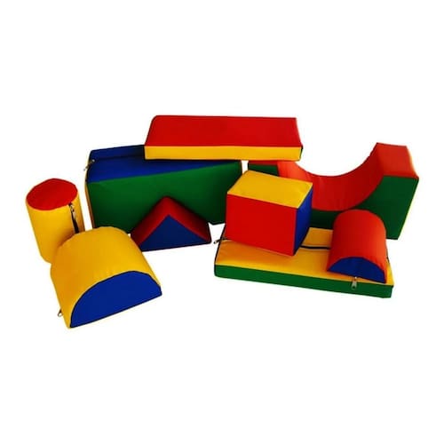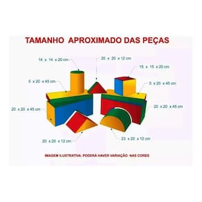 Uso: Este material permite às crianças, momentos de recreação, à medida que elas brincam e constroem com os blocos. Desenvolve: Distinção de cores, formas geométricas, espessuras, organização e percepção espacial. Idade: A partir de 1 ano. Composição: Blocos de espuma com densidade 23, revestidos com material plástico Bagum colorido. Cada conjunto contém 9 peças de formas variadas, sendo que a peça maior mede 45x20x20cm.