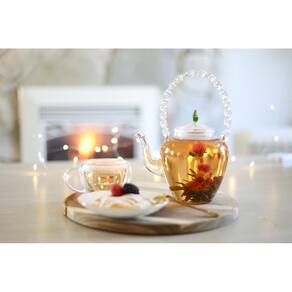 Uma peça central decorativa exclusiva Todo mundo está familiarizado com o arranjo de flores habitual como peça central, mas imagine como seus convidados ficariam impressionados ao ver uma flor colorida submersa no centro da sua mesa. Depois de beber o delicioso chá, você pode derramar água fresca e fria sobre a flor para preservá-la como uma peça central decorativa. Aproveite sua beleza por até cinco dias. Parece complicado - mas tão simples de preparar Você será um especialista após uma preparação. Basta ferver água doce e despejar cuidadosamente sobre uma flor de chá até que esteja coberta com 7,5 a 10 cm de água - para que a flor tenha espaço suficiente para florescer adequadamente. Recomendamos um bule de vidro borossilicato transparente e resistente ao calor para que você possa testemunhar o desdobramento mágico diante de seus olhos. Deixe em infusão por 5 a 10 minutos - até que as folhas estejam totalmente abertas. Gire para equilibrar sabores e despeje para desfrutar. Presenteie-se com um refresco especial de verão ao servir o chá sobre um copo de gelo. Refrigere as flores de chá em um recipiente selado e aproveite mais 2 a 3 vezes. - Uma dúzia de sabores de frutas para encantar seu palato: cada recipiente contém uma saborosa seleção de chás de floração de frutas: maçã, canela, tempero de tangerina, romã, morango, açaí, abacaxi, laranja, manga, baunilha, melão, lichia e pêssego. - Amarrado à mão por artesãos de chá: cada bola de chá florida é uma obra de arte gourmet única. Folhas de chá verde fresco e flores comestíveis, como calêndula e flores de jasmim, são costuradas à mão. Uma mistura de sabores de frutas sutis e ousados encanta todos os gostos. - Selado no pico de frescura: selamos cada bola de chá florescendo no pico de frescor dentro de um invólucro hermético para garantir que seu delicioso chá esteja pronto quando você estiver. - Chás de qualidade premium lindamente embalados: nossas lindas latas são presentes ideais para quem bebe chá em sua vida que aprecia algo especial. Por que dar uma dúzia de flores quando você pode dar uma dúzia de chás de flores? Ela vai se lembrar de você a cada gole. - GARANTIA DE 100% DE DEVOLUÇÃO DO DINHEIRO: Compre com total confiança sabendo que estamos orgulhosos de apoiar nossas flores de chá florescendo com satisfação total e garantia de devolução do dinheiro. Se você não ama absolutamente seus chás, queremos que você nos avise.