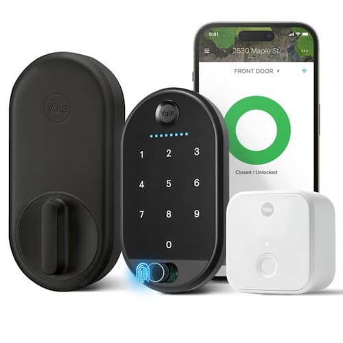 - Várias maneiras de desbloquear: aproveite o acesso seguro para sua família, amigos e muito mais. Oferece toque de impressão digital, códigos de teclado, desbloqueio automático opcional, uma chave de backup ou compartilhe chaves virtuais no aplicativo Yale Access.