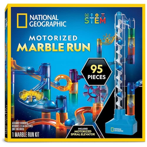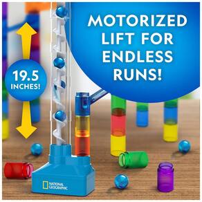 Desfrute de corridas infinitas com o elevador motorizado deste kit de marble run. Com um elevador que pode levar suas bolinhas até 40,64 cm de altura e soltá-las na pista, crie uma máquina de movimento perpétuo que leva suas bolinhas de volta ao topo continuamente. Com 61 peças de construção, 20 bolinhas e um elevador espiral de 14 peças, tenha tudo para criar infinitas configurações de pistas de mármore. Expanda qualquer Marble Run Glow-in-the-Dark da National Geographic com este kit de 95 peças. Compatível com conjuntos existentes, incluindo o elevador espiral, você pode criar pistas ainda maiores! Aprenda com a National Geographic - a diversão sempre inclui aprendizado. O Guia de Aprendizagem incluso contém fatos fascinantes sobre física, movimento e muito mais, além de dicas para construir pistas de mármore incríveis. Brinquedos educativos de alta qualidade - orgulhamo-nos de produzir os melhores brinquedos educativos práticos de ciências, todos apoiados por um serviço excepcional.