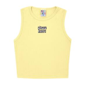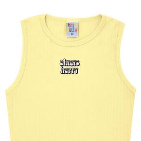 As meninas vão poder sentir a liberdade e o conforto dos dias quentes do verão! Confeccionada em tecido malha canelada na cor amarela, a blusa no modelo regatinha possuí aplique bordado com escrita "Always happy" na parte frontal da peça. Elas podem combinar entre si no look e arrasrem nas brincadeiras. *Tradução "Sempre feliz"